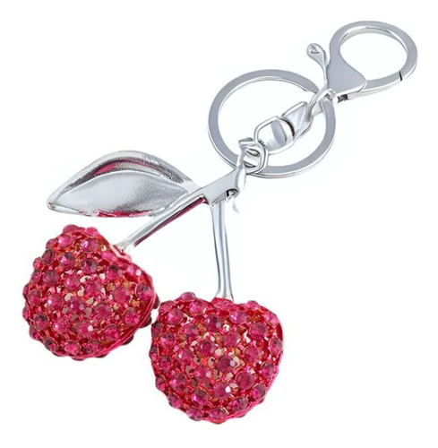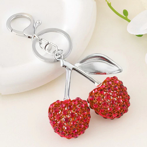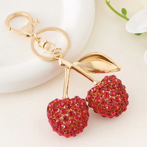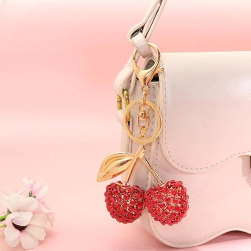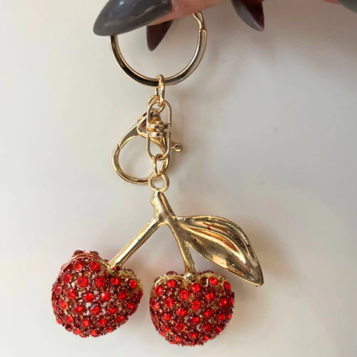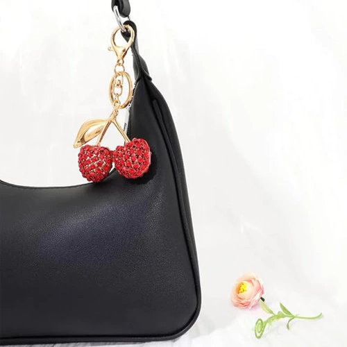 “Charm de cerezas metálicas con strass brillante. Un accesorio premium que transforma tu cartera en un statement de estilo.”
