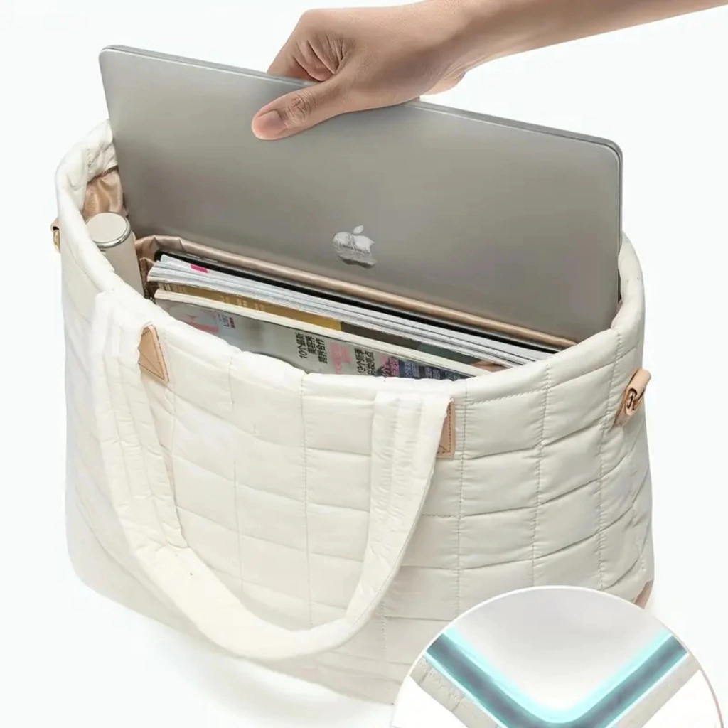 Tote acolchada y elegante en eco-cuero premium. Capacidad real para notebook 17", múltiples compartimentos y grip trasero para carry-on.