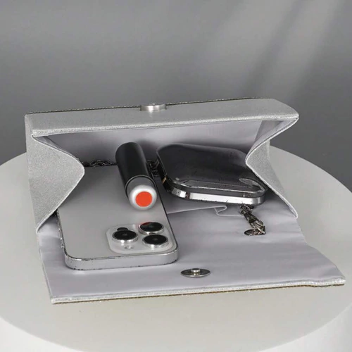 Su formato rígido y elegante incluye asa metálica fija y correa desmontable, para que lo lleves como sobre, en la muñeca o cruzado.