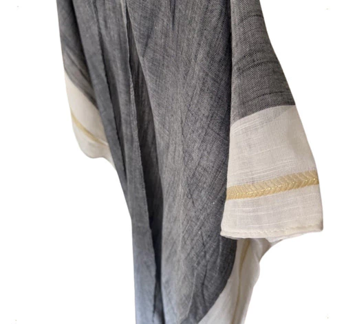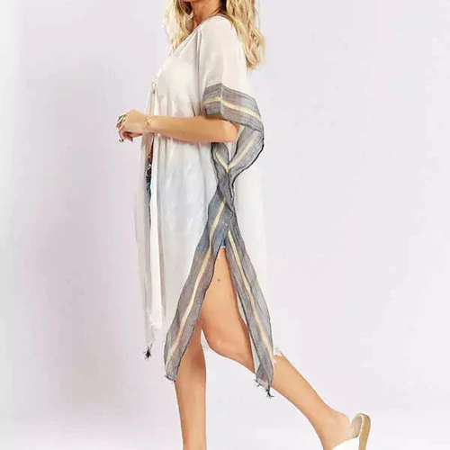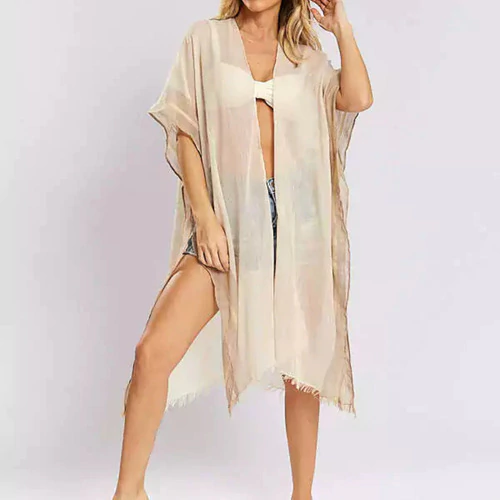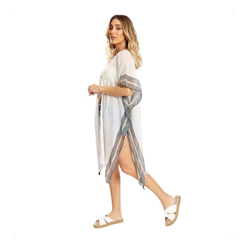 Disponible en beige, crema y negro, este kimono largo se adapta a múltiples looks: sobre traje de baño, con shorts y top, o como capa liviana para tardes de paseo. Su tela rayada 100% poliéster aporta ligereza y movimiento, mientras que la costura en las mangas mejora el calce sin perder fluidez.