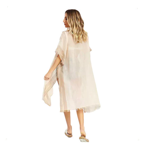 El Kimono Bangkok de Elisabeth&Co fue diseñado para mujeres que buscan estilo, frescura y versatilidad en sus días de verano. Su corte recto, textura tipo seda y detalles de flecos lo convierten en el complemento ideal para la playa, la pileta o cualquier salida informal con aire bohemio.