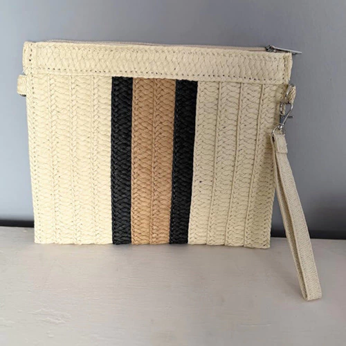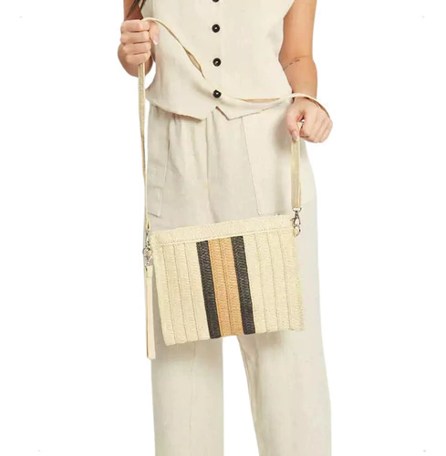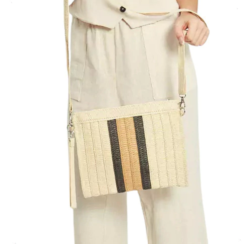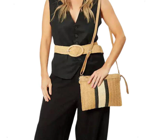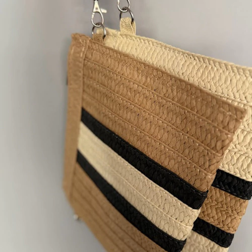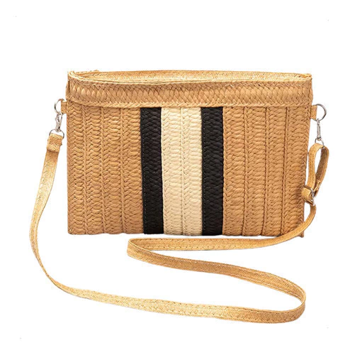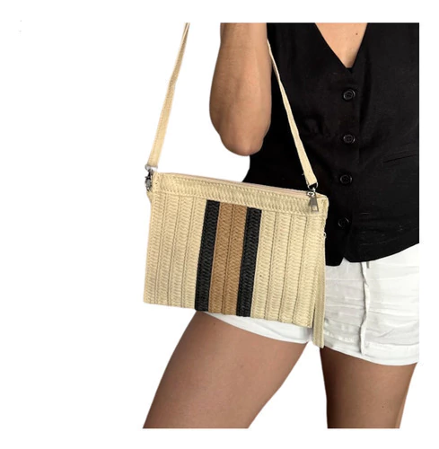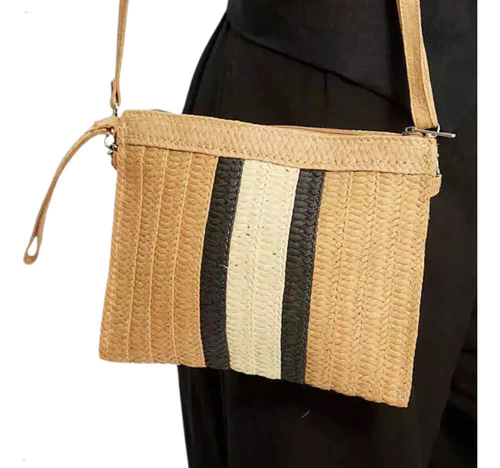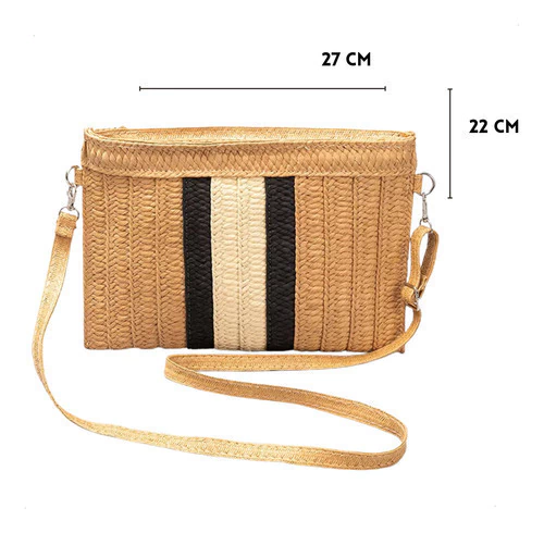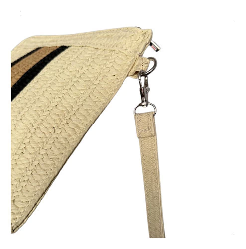 Confeccionada en rafia/papel de arroz, transmite frescura, naturalidad y estilo en un formato tipo sobre, compacto y liviano que se adapta a cualquier ocasión.
