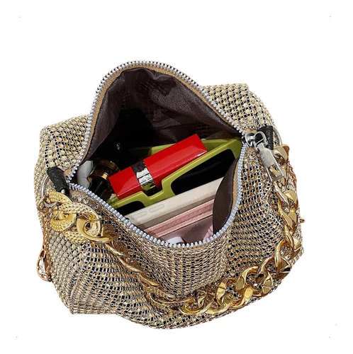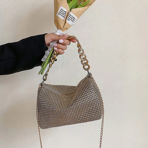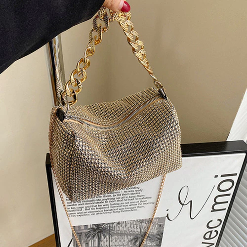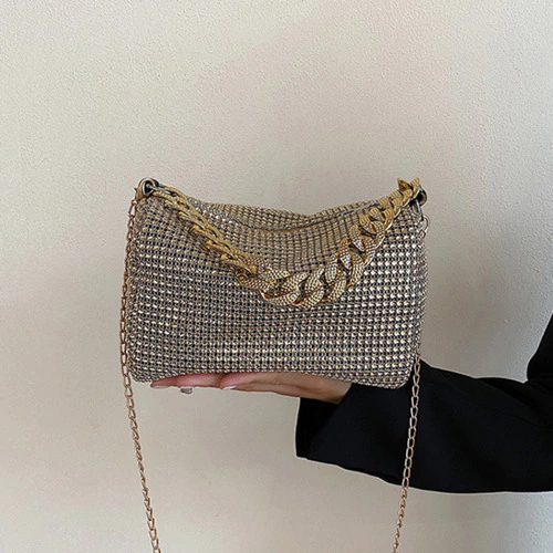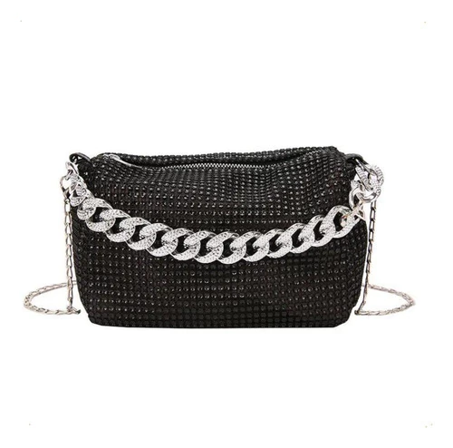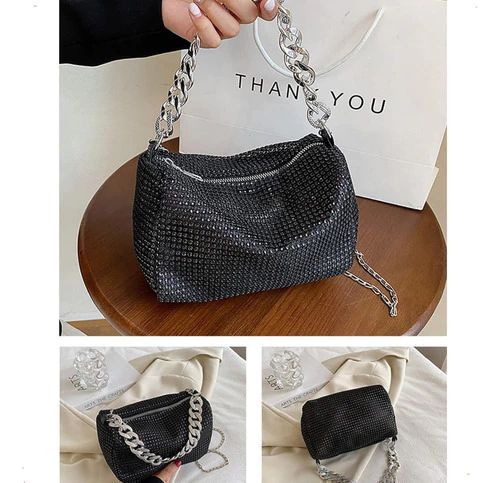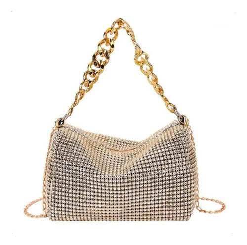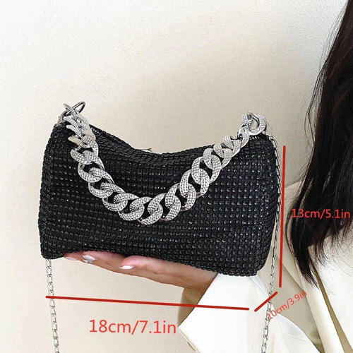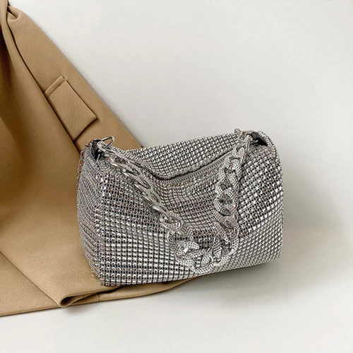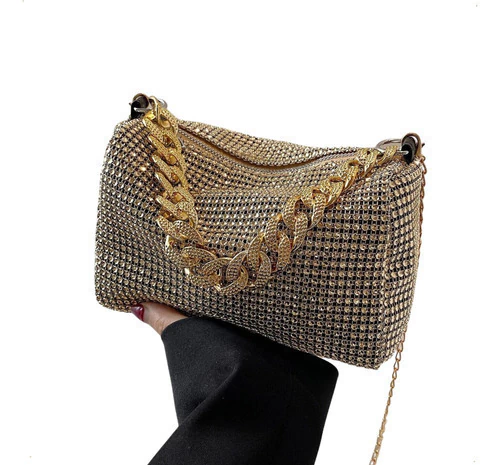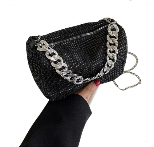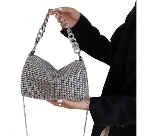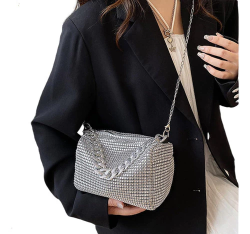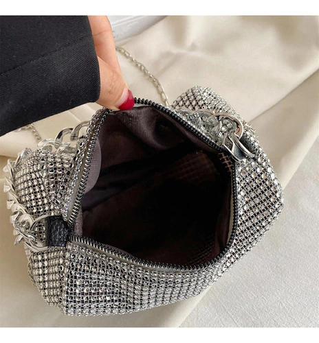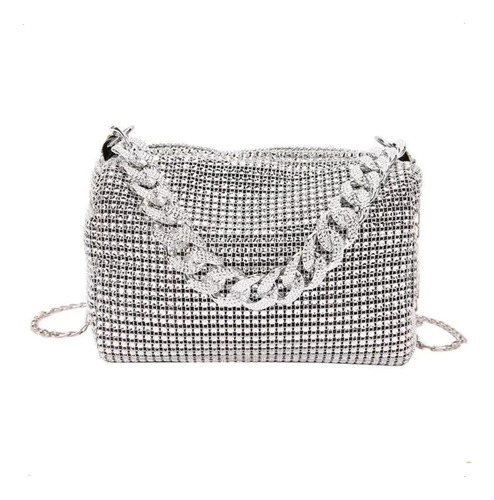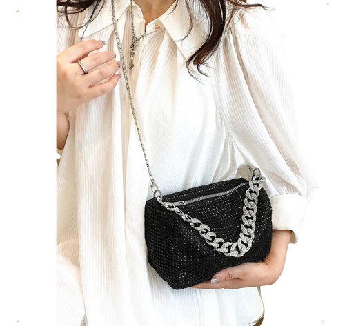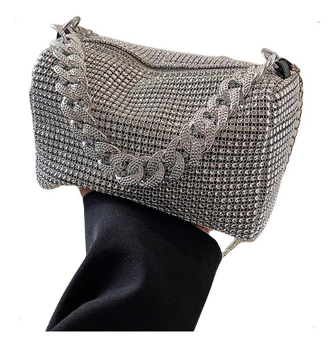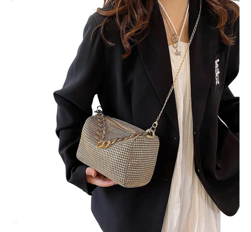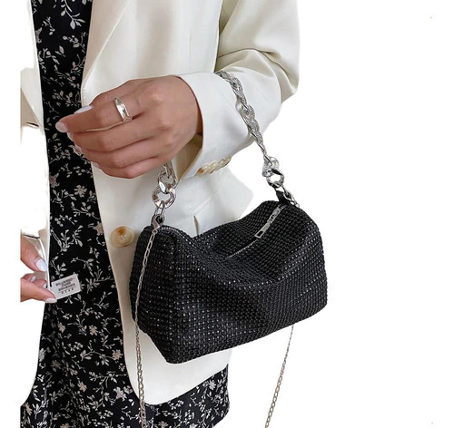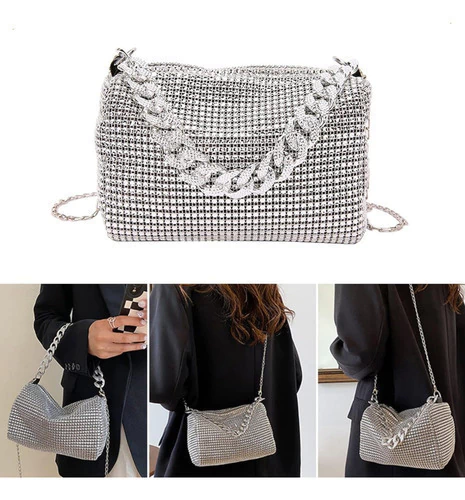 mini bag brillante, cartera gala mujer, bolso noche con strass, cartera compacta elegante, cartera para fiestas, clutch con diamantes fantasía, cartera plateada dorada negra, bolso con correa desmontable, cartera eventos