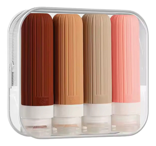 Este set incluye 4 botellas de silicona premium de 90ml, ideales para transportar shampoo, crema, gel o loción en vuelos y escapadas. Cada frasco tiene textura acanalada, sistema antigoteo y apertura amplia para rellenar y limpiar fácilmente. El estuche transparente con cierre asegura orden visual y protección total.